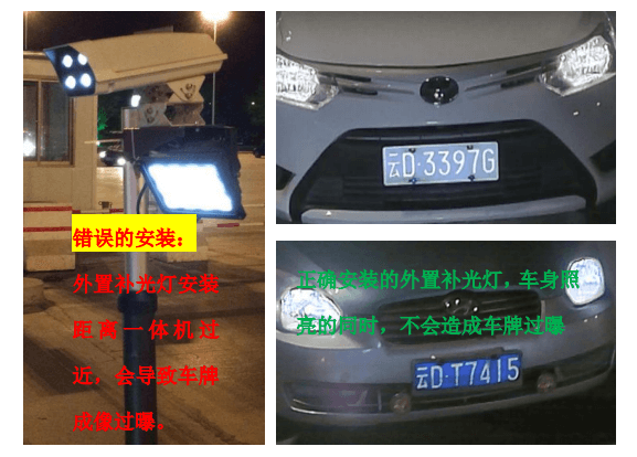 外置補光燈推薦采用白色LED補光燈,20~30W,聚光性質(zhì). 安裝高度要和攝像機保持在0.5米~0.7米的距離,外置補光燈的亮斑直接打在車牌或者車牌偏下一點,可以根據(jù)車牌過曝情況做微調(diào),比如攝像機離地面高度1.6米,補光燈裝在同一根立柱0.9米~1.1米高; 注意:特別需要避免與以下外置補光燈錯誤的安裝情形: 外置補光燈與攝像機的安裝距離過近,如下圖,兩者的安裝距離小于30cm,補光燈的光線會直接被車牌表面的反光涂層反射到鏡頭,導(dǎo)致車牌在視頻圖像中過曝,顯得發(fā)白,影響 終的識別效果.